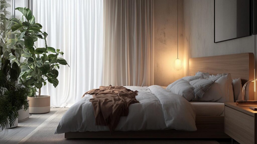 La superposition de différentes textures crée une richesse sensorielle qui invite à la détente. Imaginez un lit habillé d'un drap en lin naturel, surmonté d'une couverture en coton épais et agrémenté de coussins aux housses variées. Cette approche ajoute de la dimension visuelle tout en multipliant les occasions de confort tactile. Un tapis doux et moelleux au pied du lit prolonge cette sensation de cocooning dès le réveil. Les textiles confortables ne se limitent pas au lit : pensez aux rideaux légers qui filtrent la lumière naturelle en apportant une texture supplémentaire à l'ensemble de la pièce.
